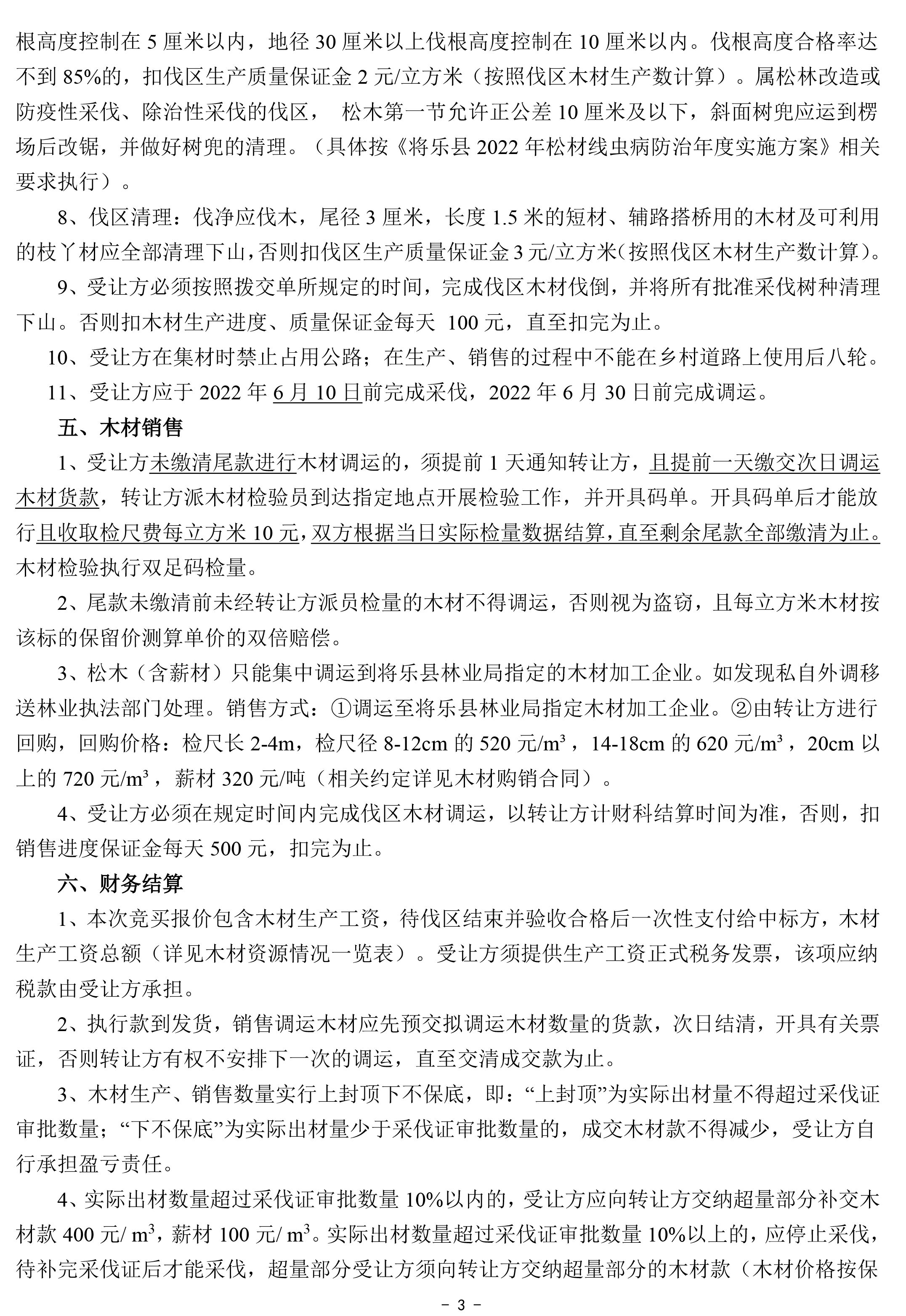 重要信息披露 | 1、標的簡介所列的出材量等數據僅供參考,標的以現狀交付,轉讓方及交易中心不承擔標的面積與實測面積、標的出材量與實際出材量差異等責任,不調整相應的成交價格。 2、本次競買報價包含木材生產工資,木材生產工資總額詳見木材資源情況一覽表,待伐區結束并驗收后一次性支付給受讓方。 3、銷售費用、成交后發生的政策變化費用、稅收均由受讓方承擔。 4、松木(含薪材)只能集中調運到將樂縣林業局指定的木材加工企業。如發現私自外調的,將移送林業執法部門處理。銷售方式:①調運至將樂縣林業局指定木材加工企業。②由轉讓方指定單位進行收購(相關約定詳見木材購銷合同)。 5、受讓方應于2022年6月10日前完成采伐,2022年6月30日前完成調運。 6、未盡事宜詳見木材資源情況一覽表、競買約定、木材生產承包合同(范本)、木材購銷合同(范本)、伐區位置示意圖等本公告其他附件。 | ||