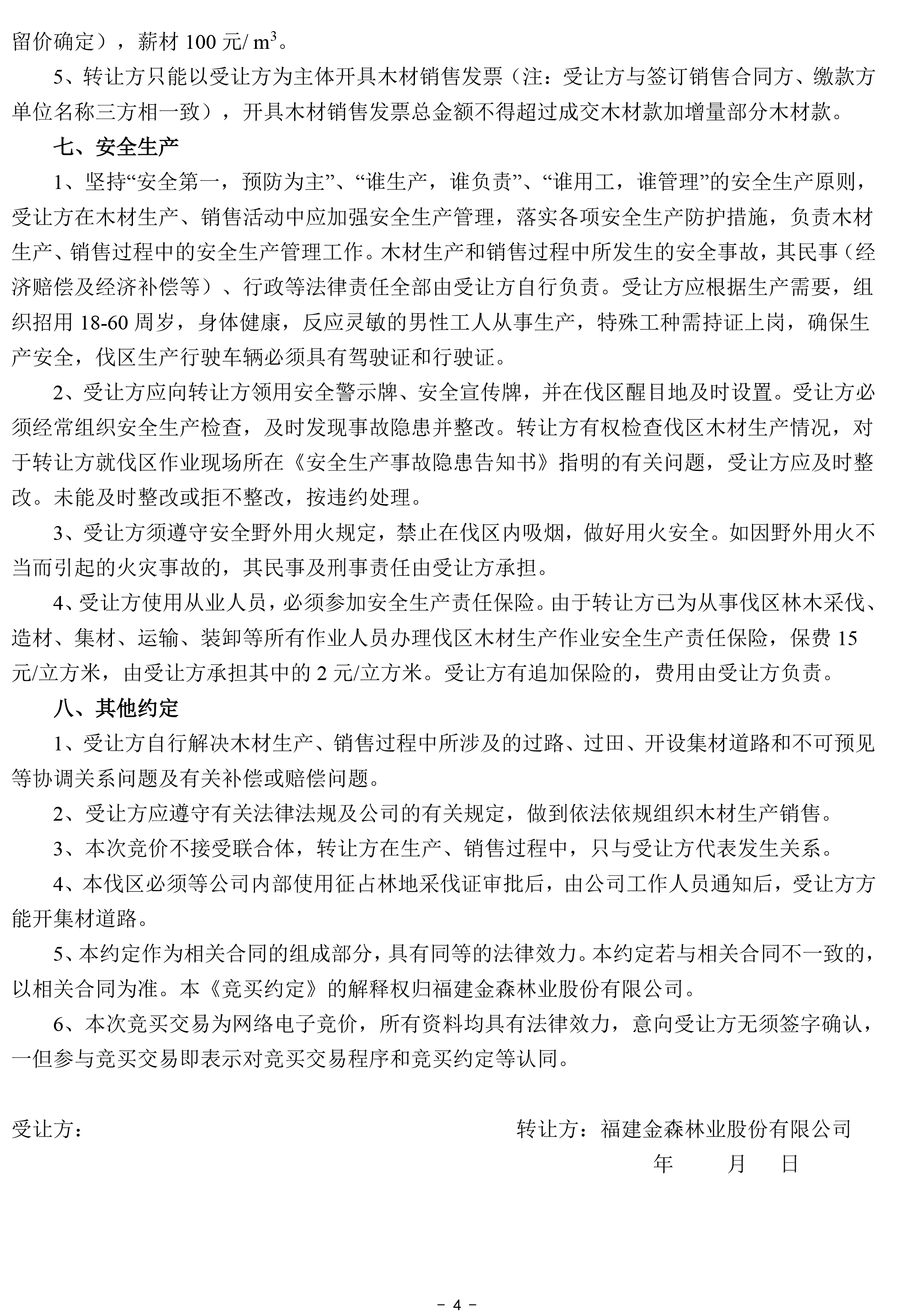 成交確認、價款支付及合同簽訂 | 1 .成交后的兩個工作日內受讓方以微信、郵箱等方式收到《成交通知書》掃描件或電話通知;若受讓方未及時收到成交通知書的,請主動與轉讓方聯系。 2.價款交納日期及方式:成交后,受讓方須于2022年4月5日17:00前將首期木材款(詳見木材資源情況一覽表)及每標生產風險保證金6.5萬元(含木材生產進度、質量保證金3萬元;銷售進度保證金1.5萬元;安全生產保證金2萬元)轉入轉讓方指定銀行賬戶,并與轉讓方簽訂《木材生產承攬合同》和《木材購銷合同》。尾款交付方式以木材資源情況一覽表為準。 轉讓方指定銀行賬戶如下: 戶名:福建金森林業股份有限公司 開戶銀行:福建將樂成功村鎮銀行股份有限公司 賬號:9031510010010000033058 3.受讓方不依據本公告的要求履約的,視為自動放棄受讓資格,其已交納的交易保證金不予退回,并對交易中心因此造成的損失承擔賠償責任,轉讓方有權將該標的重新組織競買交易。 | ||